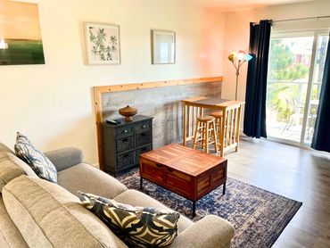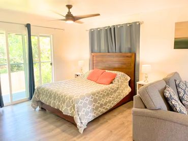 This is a downstairs unit with a large living space, wet bar, queen bed and pull-out sofa (with full size bed). It has an extra large bathroom with double sinks, walk in tiled shower. A sliding door leads to the garden patio. Max. 3 people.